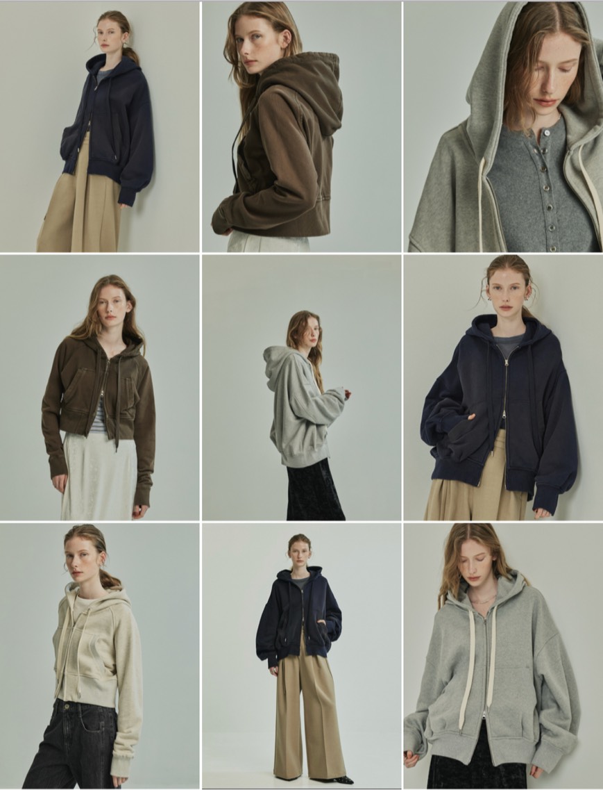 ショート丈の身頃と長めの袖のメリハリバランスが最大の特徴。上半身をすっきりと見せ、自然な脚長効果を演出します。太幅のフード紐が、全体のスタイリッシュなシルエットの中でさりげないアクセントに。