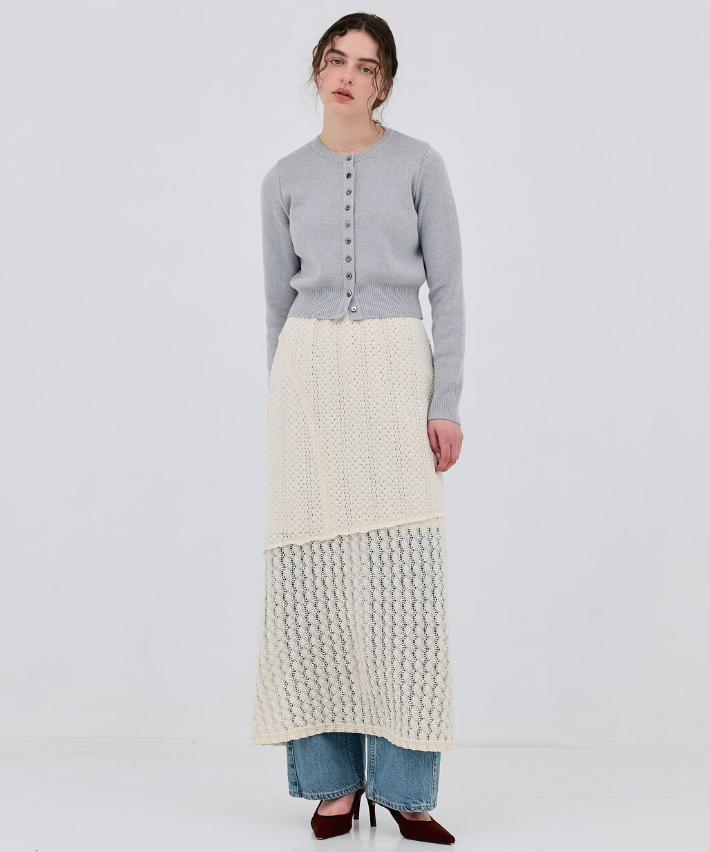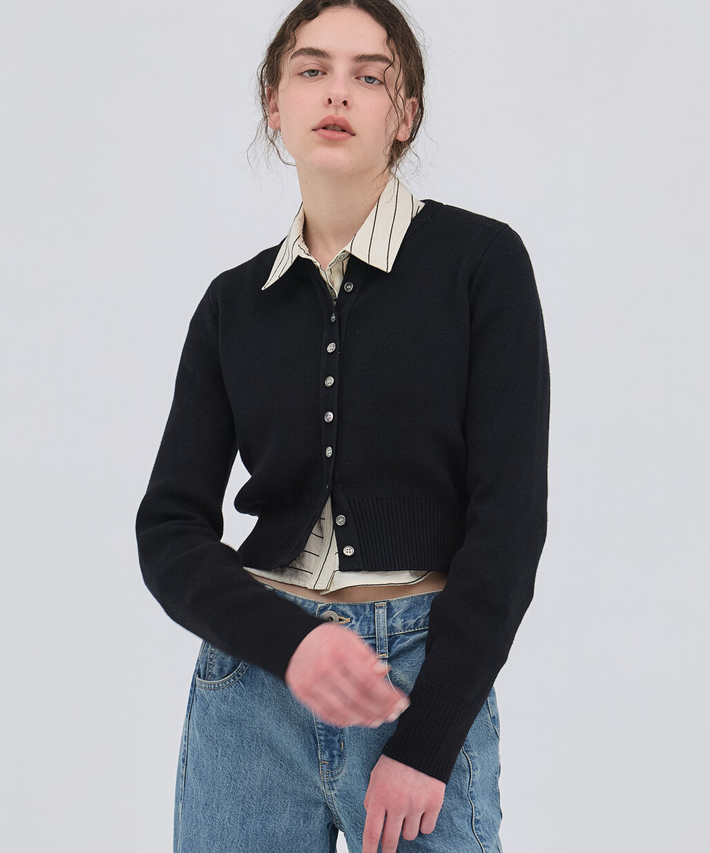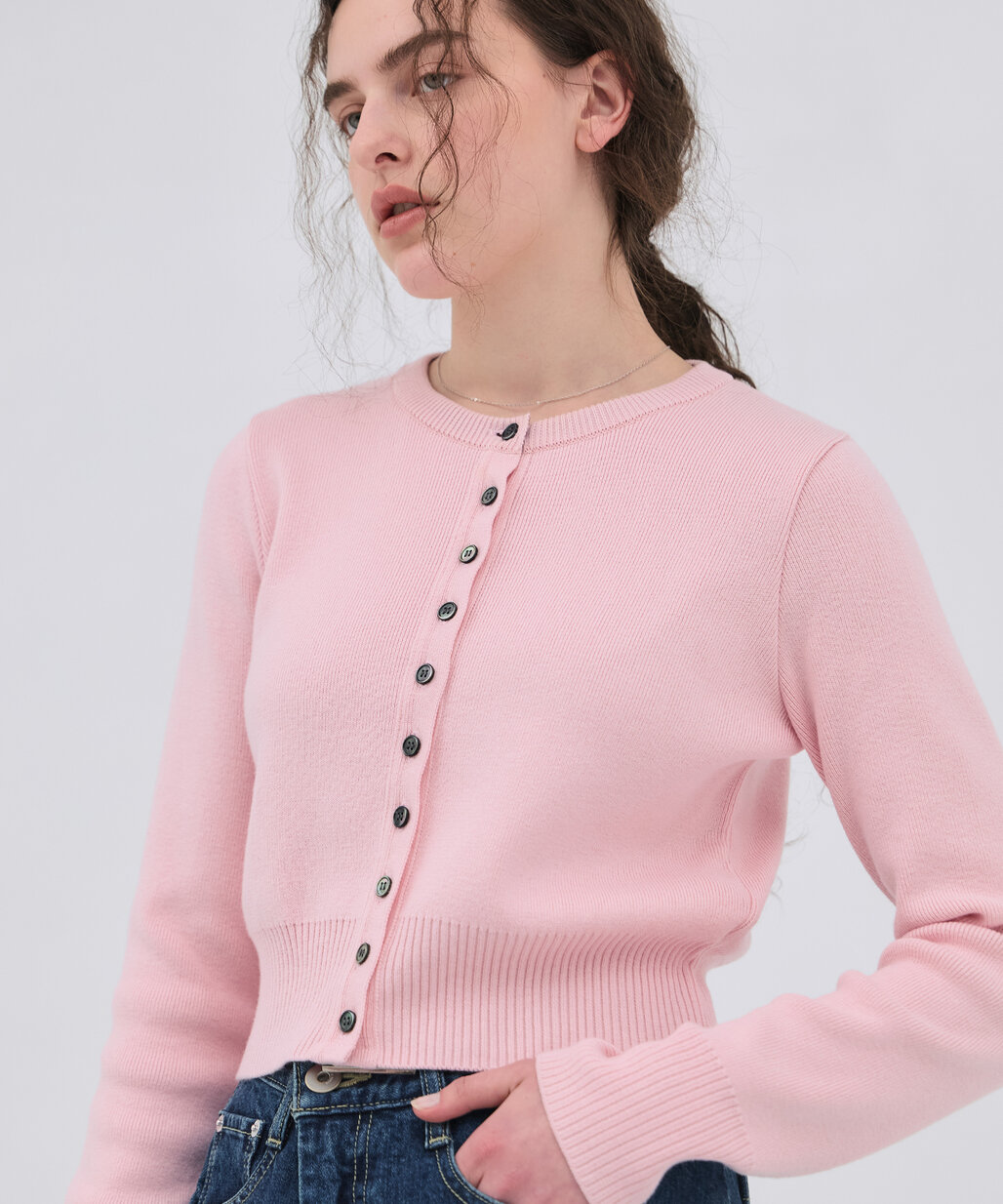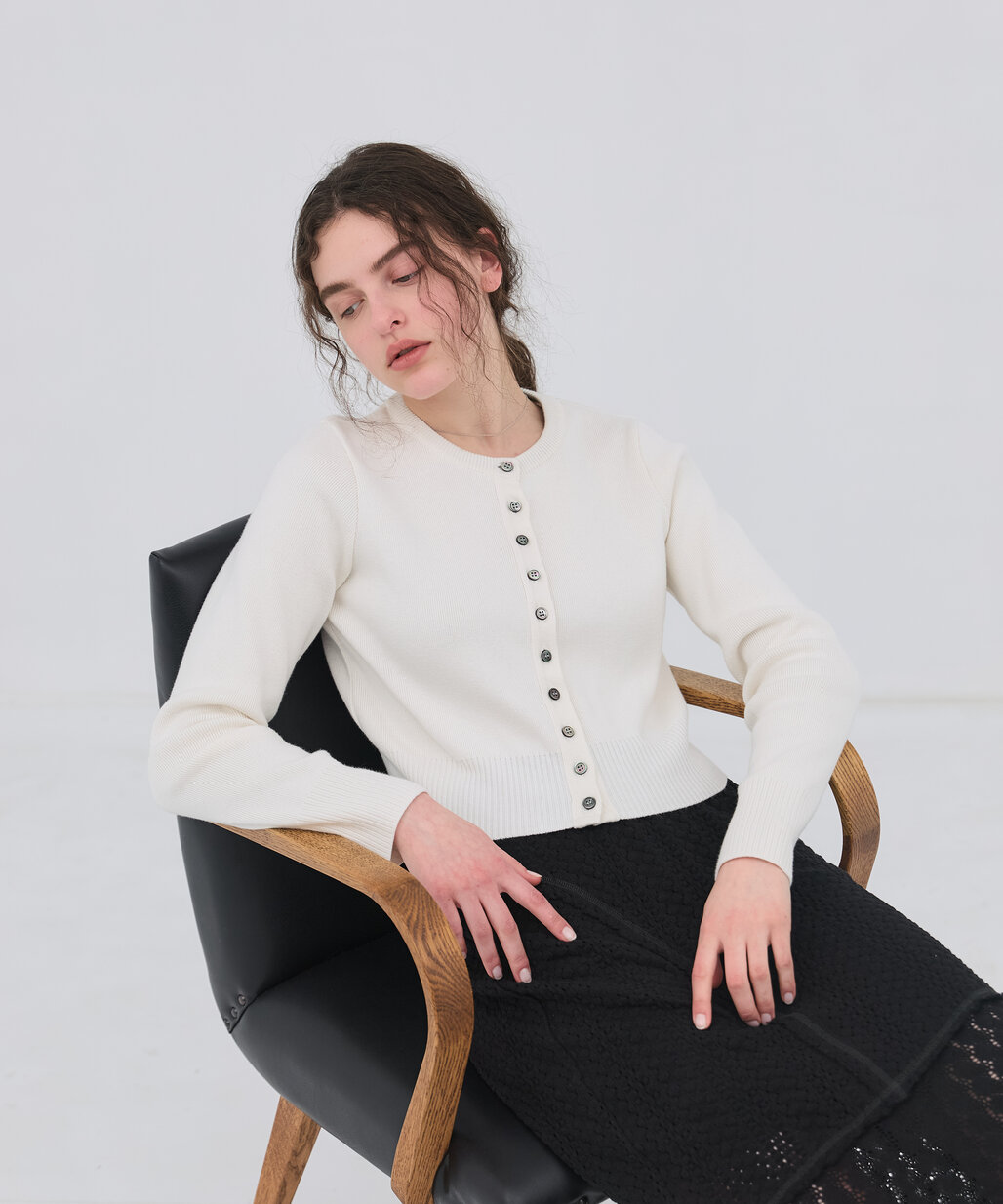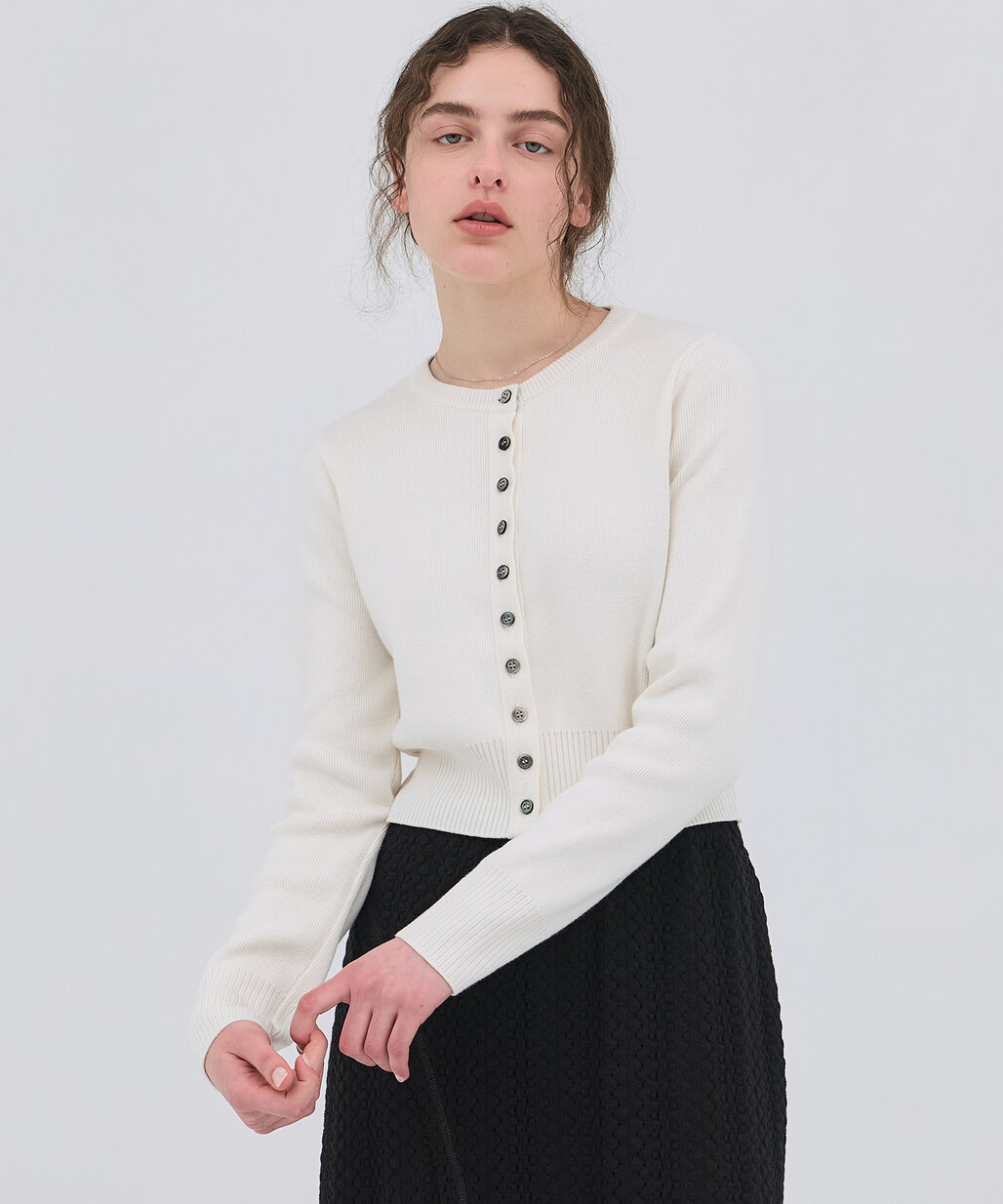 着回し力抜群のクルーネックカーデ。