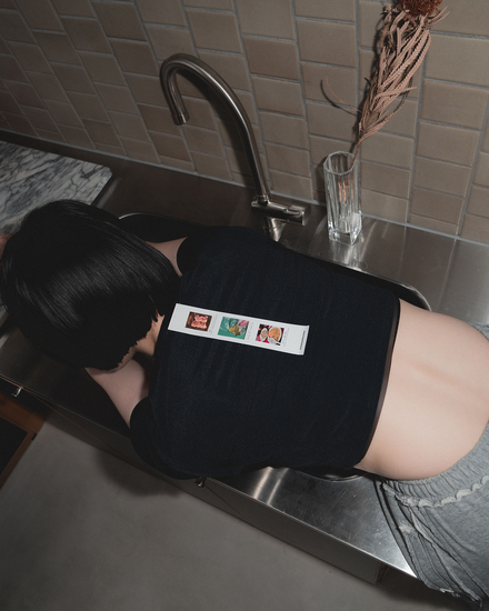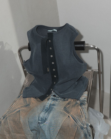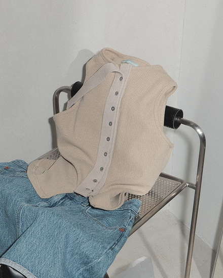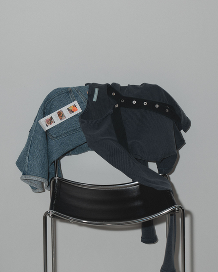通常展開にはないカラーリングを採用し、より洗練された印象に仕上げました。顔料インクによるヴィンテージライクなリブ地に、ストーンウォッシュ加工を施したヘビーウェイトのコットンテープをアクセントとしてプラス。異なる質感が絶妙に調和し、テープ先にはオリジナルのメタルクリップを配しています。タンクトップは一番上のスナップのみを留め、インナーを覗かせたスタイリングもおすすめです。